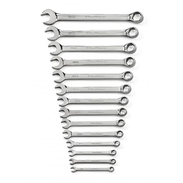15° offset for better access in tight spacesOff-corner loading design on box end provides better grip and reduces fastener roundingOpen end off-corner loading design provides up to 25% more torqueSize conveniently stamped on the head and beam for quick identificationManufactured from alloy steel for better strength and longer tool lifeBright, full polish chrome finish wipes easily clean to resist rust and corrosionMeets or exceeds ASME specificationsPlastic wrench rack included for tool retention and storage8, 9, 10, 11, 12, 13, 14, 15, 16, 17, 18, 19, 20, 21 & 22mm