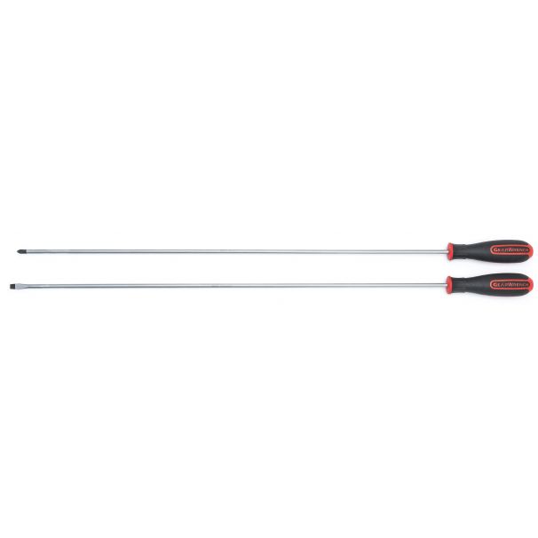 Extra long 24″ blades for increased accessTri-Lobe ergonomic feature gives the user the optimal balance of strength and efficiency“Speed Zone” handle design for faster rotation in low-torque applications like running down screwsDual-material handle offers a more comfortable grip and higher performanceDrivers resist oils and solvents, ensuring that the tool stays clean with minimal maintenanceLaser-etched size and part numbers on each screwdriver for quick identificationSolid construction with an alloy steel screwdriver shaft and a dual material handleMeets or exceeds ASME B107.6 standards for performance and qualityCarries a GEARWRENCH Lifetime Warranty on material and workmanship1/4″ x 24″ Slotted & #2 x 24″ Phillips®