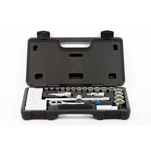 Cr-V. Steel with Harden & Knurled & Matt Finish.Contents:1-3/8″ Dr. Lever Type, 45-Teeth Gear Ratchet Handle with 2-tone grip & Quick Release16-3/8″Dr. x 30mm(L) (6PT) Short Sockets:6,7,8,9,10,11,12,13,14,15,16,17,19,21,22,24mm5-3/8″ Dr. x 46mm(L) (6-PT) Middle Sockets: 8,10,11,12,13mm2-3/8″ Dr. x 64mm(L) (6-PT) Deep Sockets: 15,17mm2-3/8″ Dr. Spark Plug Sockets: 16 & 21mm2-3/8″ Dr. Extension Bars: 75 & 22mm(L)1-3/8″ x TM-Head1-3/8″ x Universal Joint