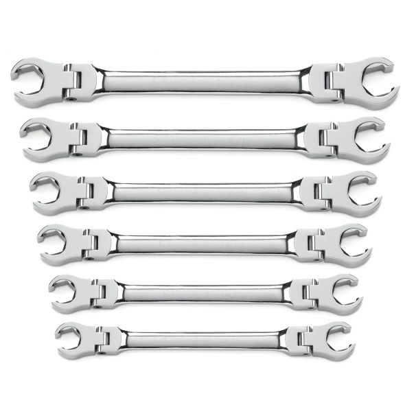 Opening in the head gives greater access to fittings used on tubingHex shaped heads maintain a more secure grip on fastenersIdeal for use on hex nuts made of softer materialsFlex head wrench ends to access restricted fasteners180° flexible head provides better access to hard-to-reach placesSizes stamped on both sides of the wrench beam for quick identificationManufactured from alloy steel for better strength and longer tool lifeBright, full polish chrome finish wipes easily clean to resist rust and corrosionPlastic tray included for tool retention and storage9mm x 11mm 10mm x 12mm 13mm x 14mm 15mm x 17mm 16mm x 18mm; 19mm x 21mm