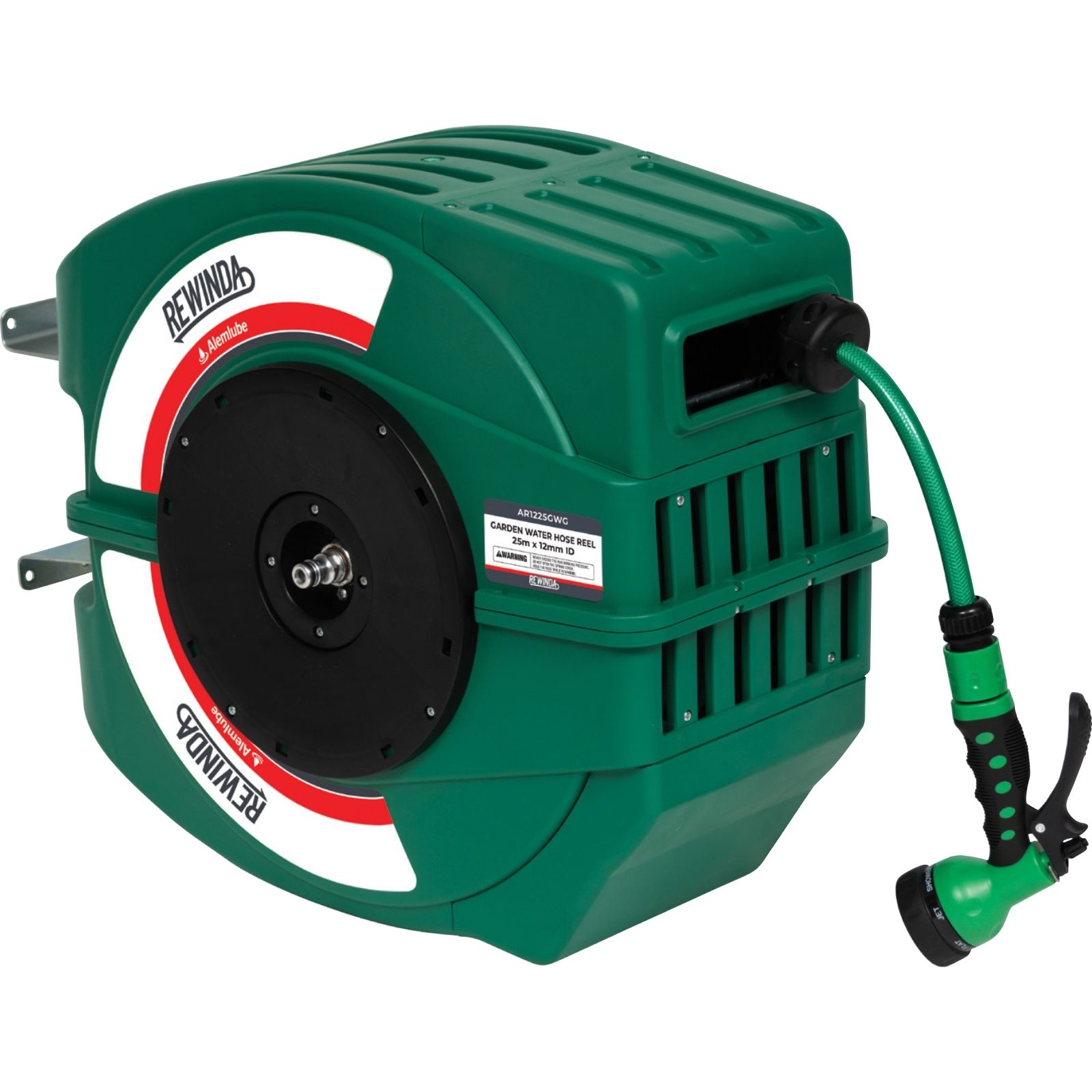 Product Description Description Alemlube Rewinda garden water hose reel 25m x 12mm ID High quality PVC flexible hose with spray nozzle High grade impact resistant UV stabilised covers Features: Alemlube Rewinda series industrial quality compressed air hose storage & retrieval system 25m x 12mm ID Highly quality PVC hose Automatic and positive latching mechanism with speed control break system The hose stops at any point to secure the hose at the desired length Sliding guide mechanism ensures the hose returns evenly to the barrel assembly Can be wall, floor or ceiling mounted Detachable steel mounting bracket enables 180° hose reel rotation High flow swivel & fluid path Updated mounting brackets fits other leading brands 3/4″ BSP(f) inlet hose & Quick Connector(f) outlet hose connections Quick Connector(m) inlet valve connection on reel 0.9m lead in hose Maximum working pressure 150psi (10 bar) Working temperature from 0°c to +60°c Weight of 10kg Size 490mm L x 580mm H x 260mm W UPC: 9323627201591 Enquiry Tell A Friend