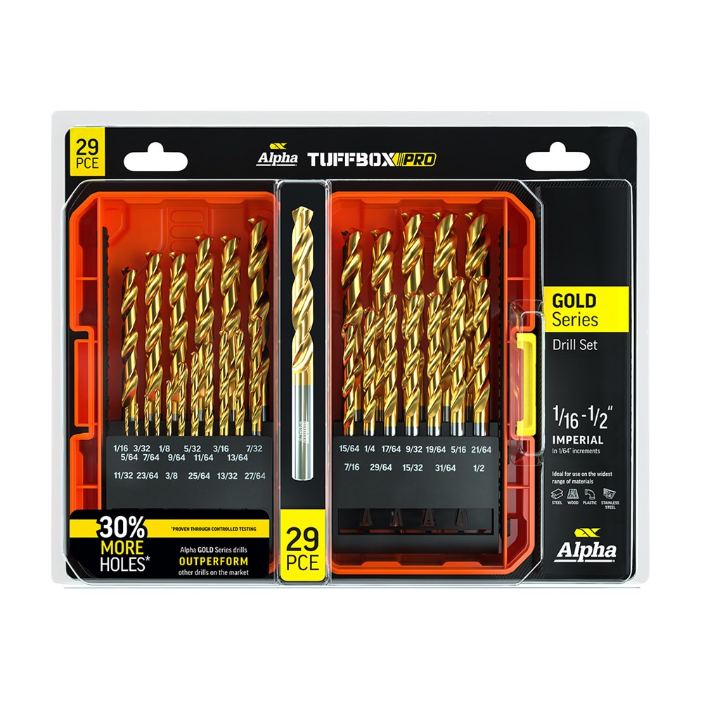 Product Description Description: 29-piece Gold Series drill set engineered for high-performance drilling in steel, stainless, wood, and plastics 135° split point reduces wandering and delivers faster penetration Titanium nitride (TiN) coated for superior lubricity, heat resistance, and longer life Manufactured from fully ground M2 HSS for strength and accuracy Supplied in Alpha’s rugged Tuffbox Pro case with reinforced hinges and secure latch Features: Gold Series TiN coating provides up to 30% more holes compared to standard drills 135° split point ensures accurate starts without the need for a pilot hole Feeds & speeds chart included in the case for operator reference Bold gold-coloured case for quick identification Compact and eco-friendly Tuffbox Pro packaging Specifications: Brand: Alpha Series: Gold Type of Measure: Imperial (inch) Material: M2 HSS with TiN Coating Set/Kit: Tuffbox Pro Shank Type: Straight Part Number: SI29TP Sizes: 1/16″, 5/64″, 3/32″, 7/64″, 1/8″, 9/64″, 5/32″, 11/64″, 3/16″, 13/64″, 7/32″, 15/64″, 1/4″, 17/64″, 9/32″, 19/64″, 5/16″, 21/64″, 11/32″, 23/64″, 3/8″, 25/64″, 13/32″, 27/64″, 7/16″, 29/64″, 15/32″, 31/64″, 1/2″ UPC (EAN): 9313601024469 Enquiry Tell A Friend