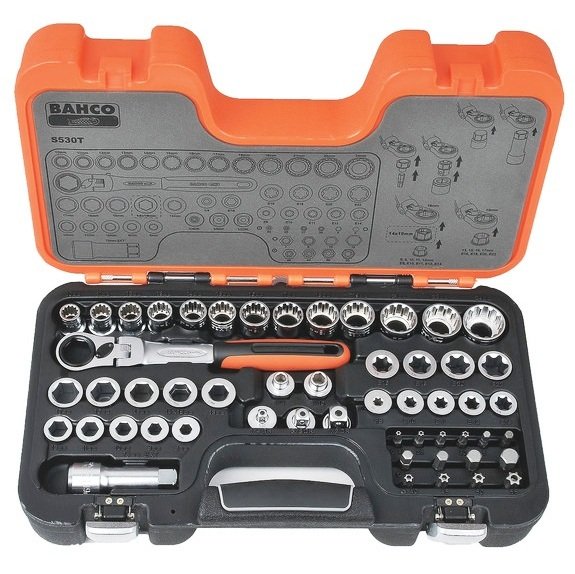 Product Description Features: Bahco 53 Piece Go-Through Socket Set Quality Bahco Product Includes: 1 pc 19mm locking reverse Go Thru Handle 1 pc 3” Go Thru triple plus extension bar 75mm with laser logo 13 pcs spline socket (mm): 10, 11, 12, 13, 14, 15, 16, 17, 18, 19, 21, 22 & 24mm 10 pcs Ring driver adapter 6pt flank: 8, 9, 10, 11, 12, 13, 14, 15, 16 & 17mm 9 pcs E-Torx ring driver adapter: E8, E10, E11, E12, E14, E16, E18, E20 & E22 8 pcs Bits S2 5/16” x 25mm (Zinc Phosphate). HEX: 7, 8, 10, 12 TTX: 40H, 45H, 50H & 55H 6 pcs Bits S2 1/4” x 25mm (Zinc Phosphate). HEX: 5, 6 TAMPER TX:20H, 27H & 30H 1 pc 19mm (3/4”) drive x 1/4” bit adapter 1 pc 19mm (3/4”) drive x 5/16” bit adapter 1 pc 19mm (3/4”) drive x 3/8” quick release adapter 1 pc 19mm (3/4”) drive x 1/4“ quick release adapter 1 pc 19mm (3/4”) drive x 1/2” quick release adapter Case Enquiry Tell A Friend
