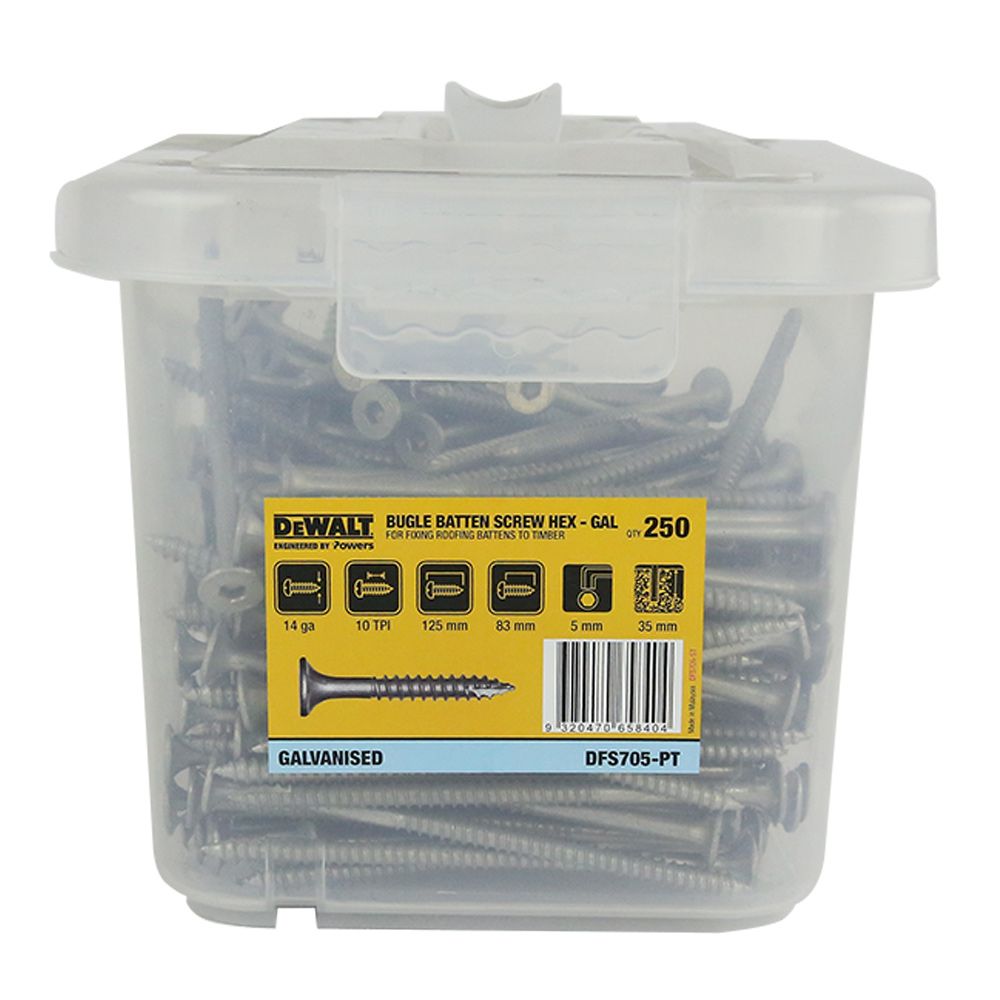 HomeShopAccessoriesScrewsDeWALT DFS705-PT Bugle Batten Screw Hex Galvanised Type 17 14ga x 125mm Quantity of 250 – Engineered by Powers