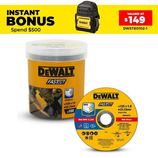 Buy DeWalt DT20540-QZ 100-Pack 125mm x 1mm x 22.23mm High Performance FASTCUT Thin Bonded Discs On Sale At Fix Right Supplies. FREE Shipping Australia Wide When You Spend $99. We Have The Best Brands At The Best Prices Including Milwaukee, Makita, HiKoKi, DeWalt and More! Check Our Redemption Deals Online For The Best Tools & The Best Prices.