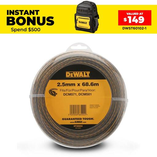 Buy DeWalt DT20652-QZ 68m x 2.5mm String Trimmer Line Suits DCM5713N-XE On Sale At Fix Right Supplies. FREE Shipping Australia Wide When You Spend $99. We Have The Best Brands At The Best Prices Including Milwaukee, Makita, HiKoKi, DeWalt and More! Check Our Redemption Deals Online For The Best Tools & The Best Prices.