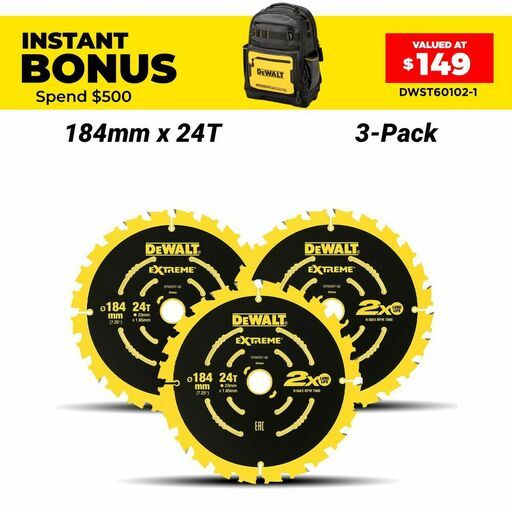Buy DeWalt DT90261-QZ 3-Pack 184mm x 24T (16/20mm) EXTREME 2x Life Circular Saw Blade On Sale At Fix Right Supplies. FREE Shipping Australia Wide When You Spend $99. We Have The Best Brands At The Best Prices Including Milwaukee, Makita, HiKoKi, DeWalt and More! Check Our Redemption Deals Online For The Best Tools & The Best Prices.