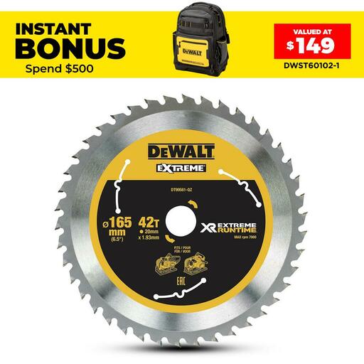 Buy DeWalt DT99561-QZ 165mm (6.5″) 42T Extreme Circular Saw Blade On Sale At Fix Right Supplies. FREE Shipping Australia Wide When You Spend $99. We Have The Best Brands At The Best Prices Including Milwaukee, Makita, HiKoKi, DeWalt and More! Check Our Redemption Deals Online For The Best Tools & The Best Prices.