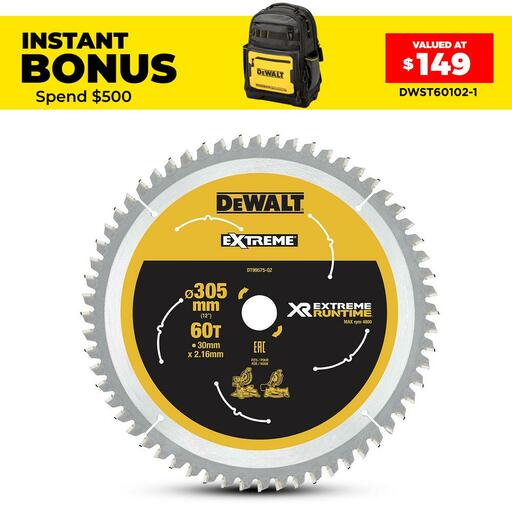 Buy DeWalt DT99575-QZ 305mm (12″) 60T Extreme Circular Saw Blade On Sale At Fix Right Supplies. FREE Shipping Australia Wide When You Spend $99. We Have The Best Brands At The Best Prices Including Milwaukee, Makita, HiKoKi, DeWalt and More! Check Our Redemption Deals Online For The Best Tools & The Best Prices.