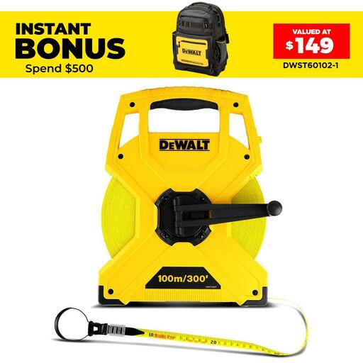 Buy DeWalt DWHT34067 100m Fibreglass Long Tape Measure On Sale At Fix Right Supplies. FREE Shipping Australia Wide When You Spend $99. We Have The Best Brands At The Best Prices Including Milwaukee, Makita, HiKoKi, DeWalt and More! Check Our Redemption Deals Online For The Best Tools & The Best Prices.