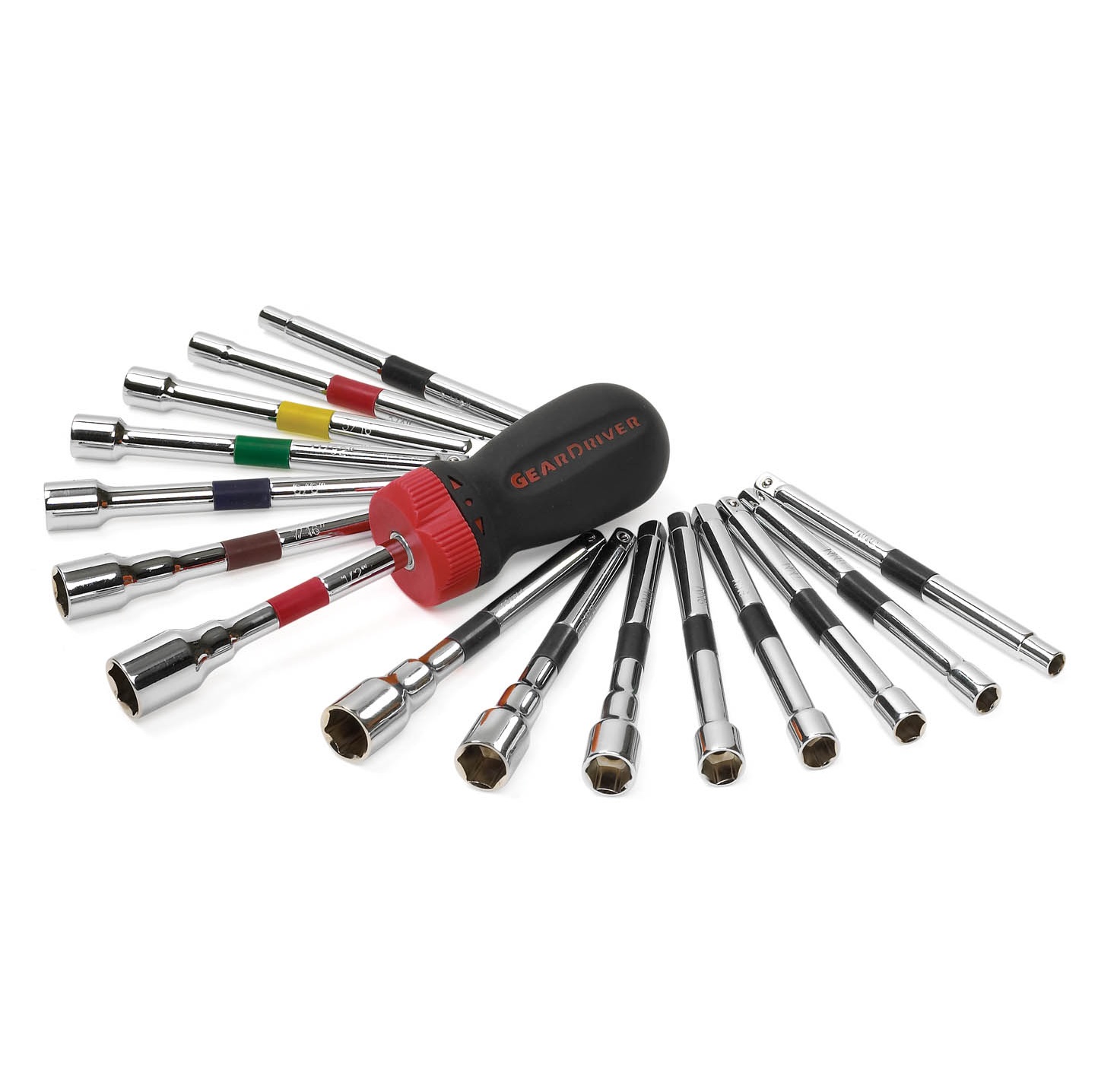 Product Description Features: Fine tooth ratcheting mechanism Interchangeable nut driver shafts Contoured handle features a dual durometer grip Includes: Stubby GearDriver™ Handle Nut Driver Shaft SAE…