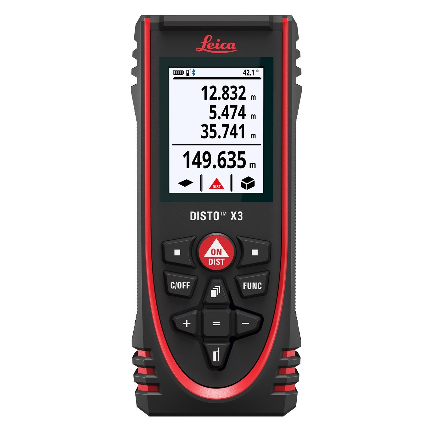 Product Description Description: Construction Site Proof The Leica DISTO X3 is perfect for tough construction site conditions. It is drop-tested up to 2 m in height, water jet and dust protected to IP 65 standards Features: Smart Room New Leica DISTO technologies in combination with the Smart Room function of the Leica DISTO Plan app* allow you to quickly create scaled floor plans on your smartphone or tablet Point to point measurement The Leica DST 360 transforms your hand-held laser device into a measurement station. It allows you to measure distances between any two points from one position Rotatable Display The Leica DISTO X3 display automatically rotates in line with the measurement direction. This means you can always read your measurement results from any angle Intuitive Easy to use buttons and functions make working with the DISTO X3 fast and intuitive Your Disto X3 The DISTO X3 is designed to make indoor laser measurements an easy task. A holster, hand loop and batteries are included Specifications: Typ. distance measuring accuracy (ISO 16331-1 certified) ± 1.0 mm Range (ISO 16331-1 certified) 0.05 up to 150 m Measuring units m, ft, in X-Range Power Technology Yes Tilt sensor Yes Tilt sensor accuracy to the housing ± 0.2° Smart Base measuring range Horizontal 360° for use with Leica DST 360 Vertical -64° to > 90° for use with Leica DST 360 Typ. tolerance of P2P function for use with Leica DST 360 ± 2mm at 2m, 5mm at 5m, 10mm at 10m Levelling range 5° for use with Leica DST 360 Memory of last measurement 20 DISTO transfer for Windows Yes DISTO Plan app for iOS and Android Yes, includes in app purchases Smart Room function support Yes General data interface Bluetooth® Smart Data interface for 3D point data Bluetooth® Smart Measurements per set of batteries up to 4’000 (reduced when used with Bluetooth®) Service life of batteries up to 8h (reduced when used with Bluetooth®) Multifunctional endpiece with automatic reference detection Yes Batteries 2x AA Alkaline Protection class IP 65 2m drop tested Yes Dimensions 132 x 56 x 29 mm Weight with batteries 184g Art. No. 850833 UPC: 7640110697054 Enquiry Tell A Friend