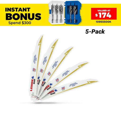 Buy Lenox 21090966GR 5-Pack 290 x 50 x 25mm 9″ 6TPI Gold Power Arc Reciprocating Saw Blade On Sale At Fix Right Supplies. FREE Shipping Australia Wide When You Spend $99. We Have The Best Brands At The Best Prices Including Milwaukee, Makita, HiKoKi, DeWalt and More! Check Our Redemption Deals Online For The Best Tools & The Best Prices.