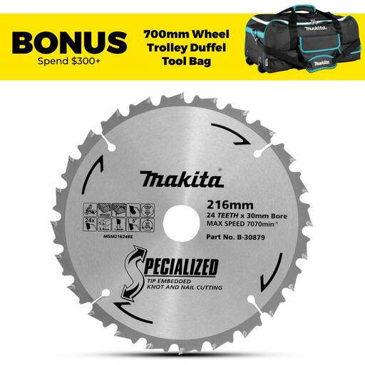 Buy Makita B-30879 216mm (8-1/2″) 24T Knot & Nail TCT Wood Saw Blade On Sale At Fix Right Supplies. FREE Shipping Australia Wide When You Spend $99. We Have The Best Brands At The Best Prices Including Milwaukee, Makita, HiKoKi, DeWalt and More! Check Our Redemption Deals Online For The Best Tools & The Best Prices.