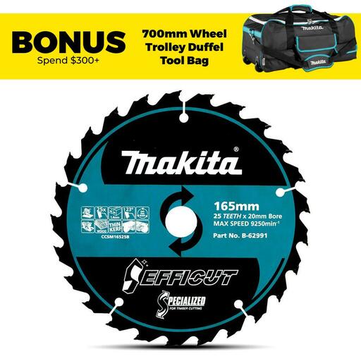 Buy Makita B-62991 165mm (6.5″) 25T Efficut TCT Saw Blade to suit Plunge Saws DSP600 & DSP601 On Sale At Fix Right Supplies. FREE Shipping Australia Wide When You Spend $99. We Have The Best Brands At The Best Prices Including Milwaukee, Makita, HiKoKi, DeWalt and More! Check Our Redemption Deals Online For The Best Tools & The Best Prices.