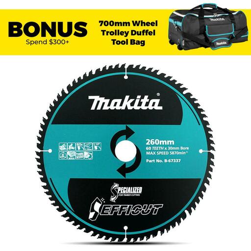 Buy Makita B-67337 260mm (10-1/5″) 60T Efficut TCT Wood Saw Blade On Sale At Fix Right Supplies. FREE Shipping Australia Wide When You Spend $99. We Have The Best Brands At The Best Prices Including Milwaukee, Makita, HiKoKi, DeWalt and More! Check Our Redemption Deals Online For The Best Tools & The Best Prices.