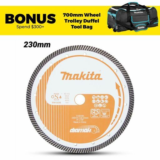 Buy Makita D-80195 230mm x 22.23mm/20mm DIAMAK Turbo Diamond Blade On Sale At Fix Right Supplies. FREE Shipping Australia Wide When You Spend $99. We Have The Best Brands At The Best Prices Including Milwaukee, Makita, HiKoKi, DeWalt and More! Check Our Redemption Deals Online For The Best Tools & The Best Prices.