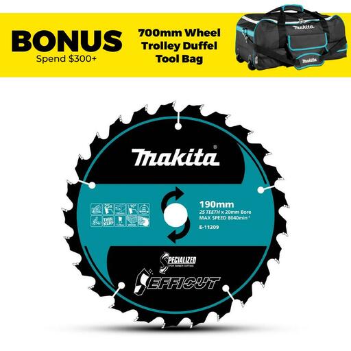 Buy Makita E-11209 190mm (7.5″) 25T Efficut TCT Wood Saw Blade On Sale At Fix Right Supplies. FREE Shipping Australia Wide When You Spend $99. We Have The Best Brands At The Best Prices Including Milwaukee, Makita, HiKoKi, DeWalt and More! Check Our Redemption Deals Online For The Best Tools & The Best Prices.