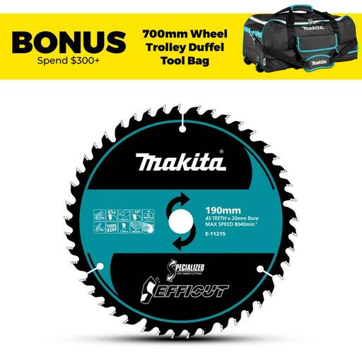 Buy Makita E-11215 190mm (7.5″) 45T Efficut TCT Wood Saw Blade On Sale At Fix Right Supplies. FREE Shipping Australia Wide When You Spend $99. We Have The Best Brands At The Best Prices Including Milwaukee, Makita, HiKoKi, DeWalt and More! Check Our Redemption Deals Online For The Best Tools & The Best Prices.