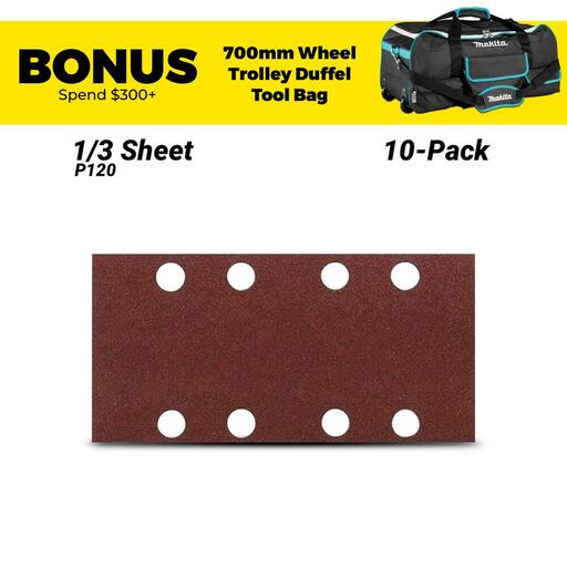 Buy Makita P-36011 10-Pack 1/3 Sheet 120 Grit Punched Abrasive Sanding Sheet On Sale At Fix Right Supplies. FREE Shipping Australia Wide When You Spend $99. We Have The Best Brands At The Best Prices Including Milwaukee, Makita, HiKoKi, DeWalt and More! Check Our Redemption Deals Online For The Best Tools & The Best Prices.