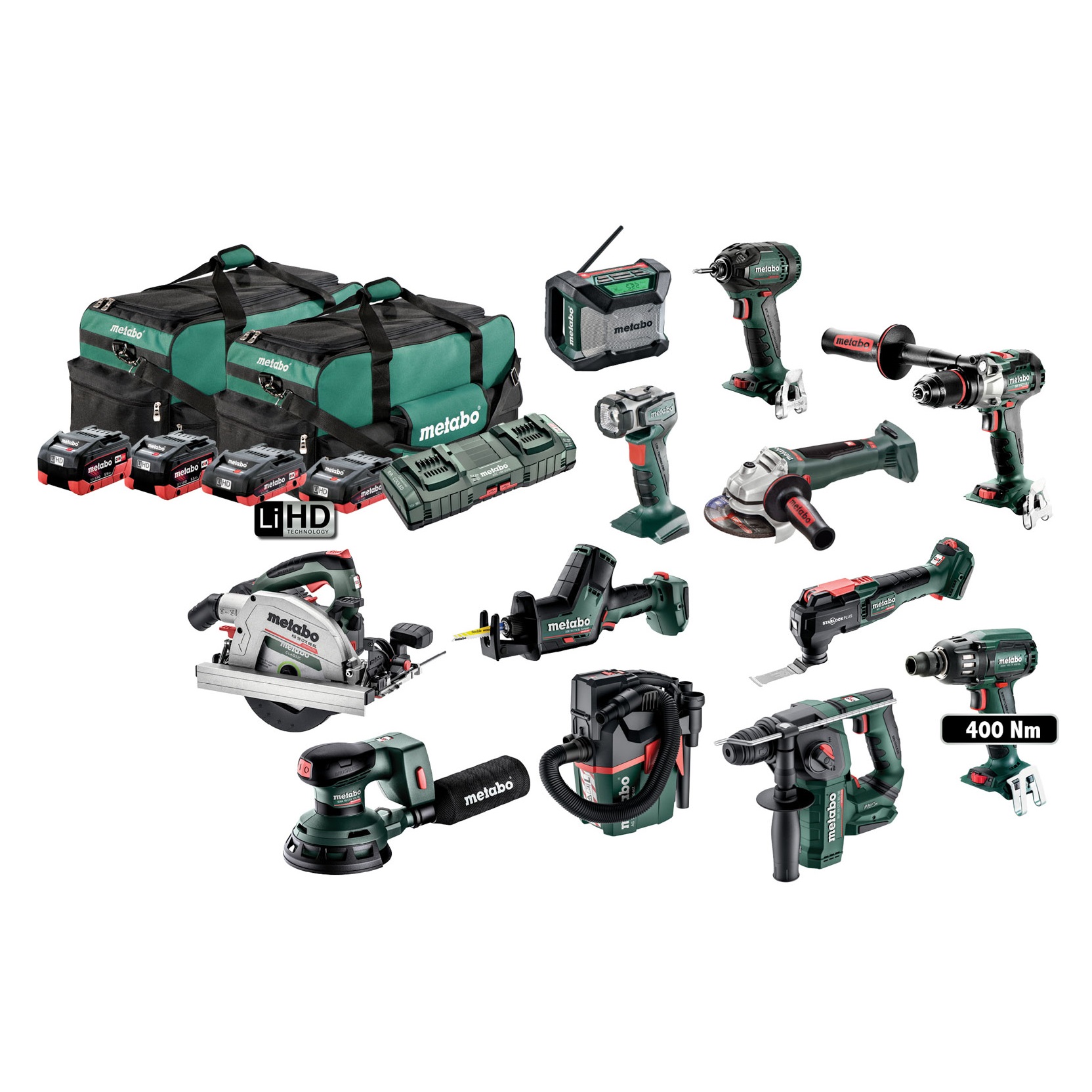 Product Description Description: Cordless Hammer Drill SB 18 LTX BL I: 130 Nm Brushless hammer drill with maximum power for demanding applications, Hammer drill function for drilling in masonry, Selectable “impuls” mode for removal of stubborn screws and for spot-drilling on smooth surfaces Cordless Rotary Hammer Drill BH 18 LTX BL 16 16 mm Brushless rotary hammer drill, Very lightweight,with 2 functions: hammer drilling and drilling Vario-Tacho-Constamatic (VTC)-Full Wave Electronics for work with materials requiring customised speeds, which remain constant under load Cordless Impact Driver SSD 18 LTX 200 BL: 200 Nm Brushless Impact Driver Unique Metabo Brushless motor for quick work progress and maximum efficiency for any application, High torque machine with low kick-back; (APS) Auto Power Shift-automatic torque reduction after drilling to prevent overtightening; Twelve speed/torque levels for a wide range of applications Cordless Impact Wrench SSW 18 LTX 400 BL 400 Nm Brushless Impact Wrench quick work progress and highest efficiency for any application, Compact cordless impact wrench with 1/2″ male square.High torque machine with low kick-back torque; Twelve speed/torque levels for a wide range of applications Cordless Angle Grinder WB 18 LTX BL 125 QUICK: Brushless Angle GrinderUnique Metabo Brushless motor for quick work progress and maximum efficiency for any application, Fast brake system for highest user safety; Slim design for prolonged comfort; Metabo Quick for tool-free disc change by means of a quick-locking nut; Tool-free adjustable guard; twist-proof Cordless Compact Sabre Saw SSE 18 LTX BL COMPACT Brushless Compact Sabre saw, Light, extremely handy saw for one or two handed operation, Especially suitable for working in difficult to reach places Cordless Circular Saw KS 18 LTX 66 BL 165 mm Brushless Circular Saw, Aluminium base plate can be directly used on guide rails, Sawdust ejection nozzle, Clearly visible cutting indicator for precise sawing after initial cut Cordless Multi-Tool MT 18 LTX BL QSL: Brushless Multi-Tool, Oscillating Cordless Multi-Tool with High Performance Metabo Quick Tool change system and VTC-Electronics Cordless Random Orbital Sander SXA 18 LTX 125 BL Brushless random orbital sander with ergonomic design and low weight for low-fatigue working, Comfortable guidance of the sander close to the surface thanks to the low overall height, Low-vibration working thanks to smooth running operation,Unique Metabo brushless motor for quick work progress and highest efficiency for any application Compact Vacuum Cleaner AS 18 L PC COMPACT Portable, compact cordless vacuum cleaner for wet and dry vacuum cleaning (IPX4), ideal for smaller cleaning and extraction jobs, Commercially approved cordless vacuum cleaner, certified for dusts of dust class L LED Lamp ULA 14.4-18 LED Powerful LED portable lamp for uniform, bright illumination of the working area, Lamp head can be tilted and locked in 12 positions and Swivelling hook. Worksite Radio R 12-18 BT Robust and compact AM/FM worksite radio with Bluetooth for wireless music enjoyment from your smart phone or tablet 2 x 5.5 Ah LiHD Battery Packs and 2 x 4.0 Ah LiHD Battery Packs , LiHD battery pack for ultimate performance and extremely long runtime with minimal temperature generation 2 x Large Tool Bags large, practical Metabo tool bag, On the inside of the bag there are five bag compartments with hook and loop straps to take three battery packs, one charger and accessories ASC 145 Duo Fast Charger Dual charging, and quite fast whilst being extremely efficient Features: 130 Nm Brushless Hammer Drill SB 18 LTX BL I 16 mm Brushless Rotary Hammer Drill BH 18 LTX BL 16 200 Nm Brushless Impact Driver SSD 18 LTX 200 BL 400 Nm Brushless Impact Wrench SSW 18 LTX 400 BL 125 mm Brushless Angle Grinder WB 18 LTX BL 125 Quick Brushless Compact Sabre Saw SSE 18 LTX BL COMPACT 165 mm Brushless Circular Saw KS 18 LTX 66 BL Brushless Multi-Tool MT 18 LTX BL QSL Brushless Random Orbital Sander SXA 18 LTX 125 BL Compact Vacuum Cleaner AS 18 L PC COMPACT LED Lamp ULA 14.4-18 LED AM/FM Worksite Radio with Bluetooth R 12-18 BT 2 x 5.5 Ah LiHD Battery Packs 2 x 4.0 Ah LiHD Battery Packs 2 x Large Tool Bags ASC 145 Duo Fast Charger UPC: 9339742001886 Enquiry Tell A Friend
