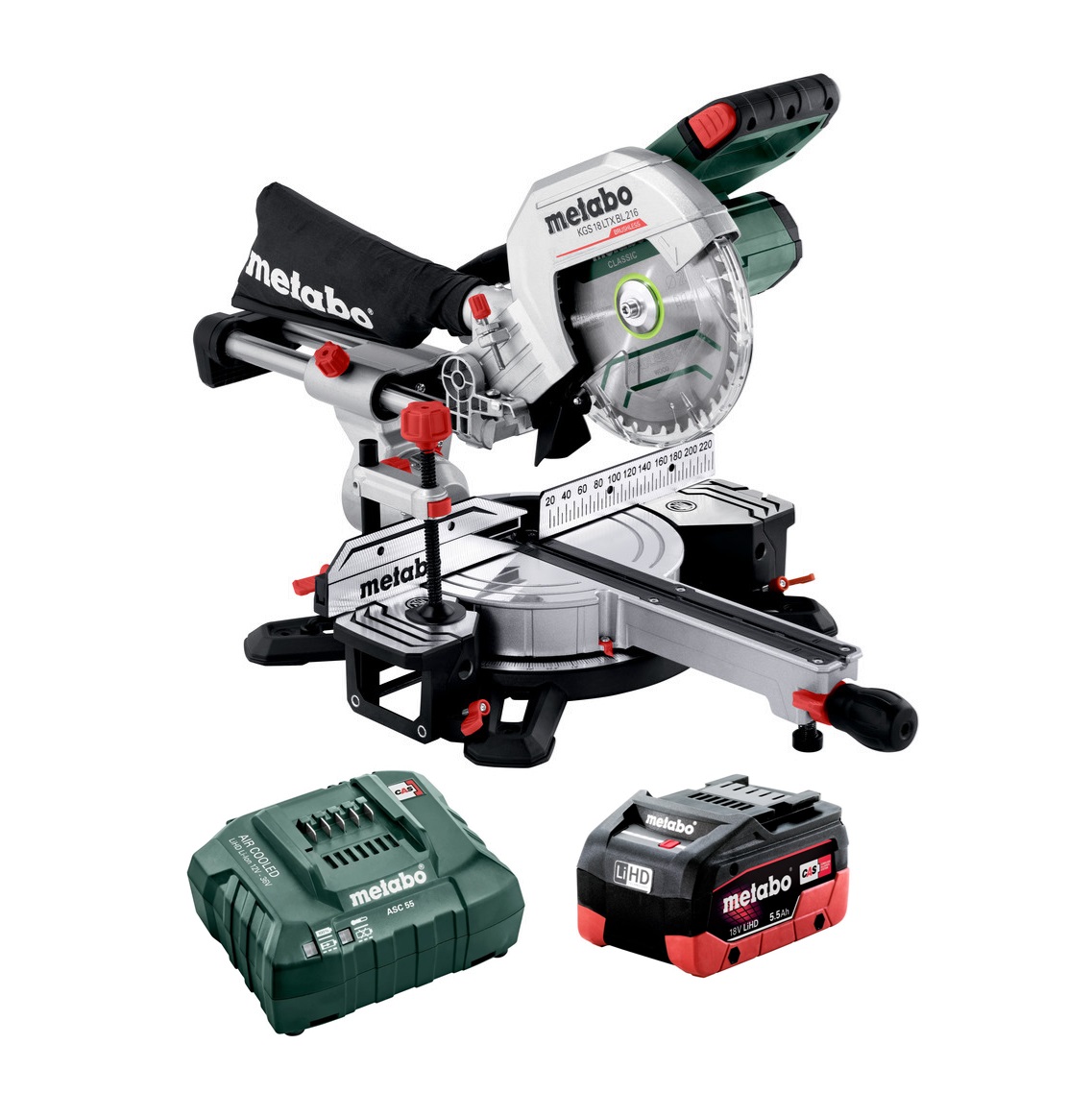 HomeShopCordless ToolsSawsMetabo KGS 18 LTX BL 216 1 HD 5.5K 18V 5.5Ah Brushless Lithium-Ion Cordless Crosscut, Mitre Saw with Sliding Function Combo Kit AU61421600