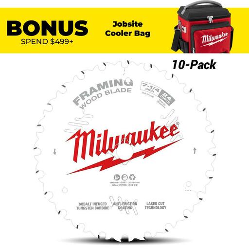 Buy Milwaukee 48418720-10 10-Pack 184mm (7-1/4″) 24-Tooth Framing Wood Circular Saw Blade On Sale At Fix Right Supplies. FREE Shipping Australia Wide When You Spend $99. We Have The Best Brands At The Best Prices Including Milwaukee, Makita, HiKoKi, DeWalt and More! Check Our Redemption Deals Online For The Best Tools & The Best Prices.