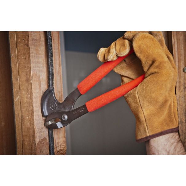 11″ Nail Puller PliersExcellent for removing damaged nails and fastenersRoll bar allows you to pull nails with a smooth, low-effort actionEasily extract nails, regardless of their sizeFunctionality of the pliers allows you to remove nails from the front or the backPlier teeth designed for an optimal grip on varied types of nailsDual handles make it quick and easy to grip, roll, and remove nails or staplesDurable forged steel construction with rubber grips for comfort and controlBlack-oxide finish resists corrosionDipped grips wipe clean easily