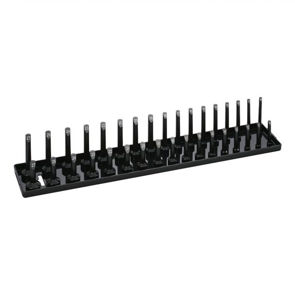 Keep your sockets organised. Holds 17x standard | 17x deep sockets – 1/2″ Sq Drv. Features sizes marked on top of the posts for easy identification.10 – 27mm1/2″ Sq Drv standard | deep sockets