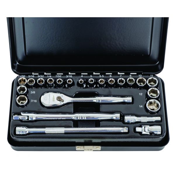 23 PCE 1/4″ METRIC & SAE SOCKET SETStandard socketsMetal carry case120xp ratchet that requires only 3 degrees of swing arc10 Metric socket 4,5,5.5,6,7,8,10,12,14mm8 SAE sockets 3/16,7/32,1/4,9/32,5/16,11/32,3/8,7/163,6,10″ extensionsUniversal joint5.45″ breaker bar