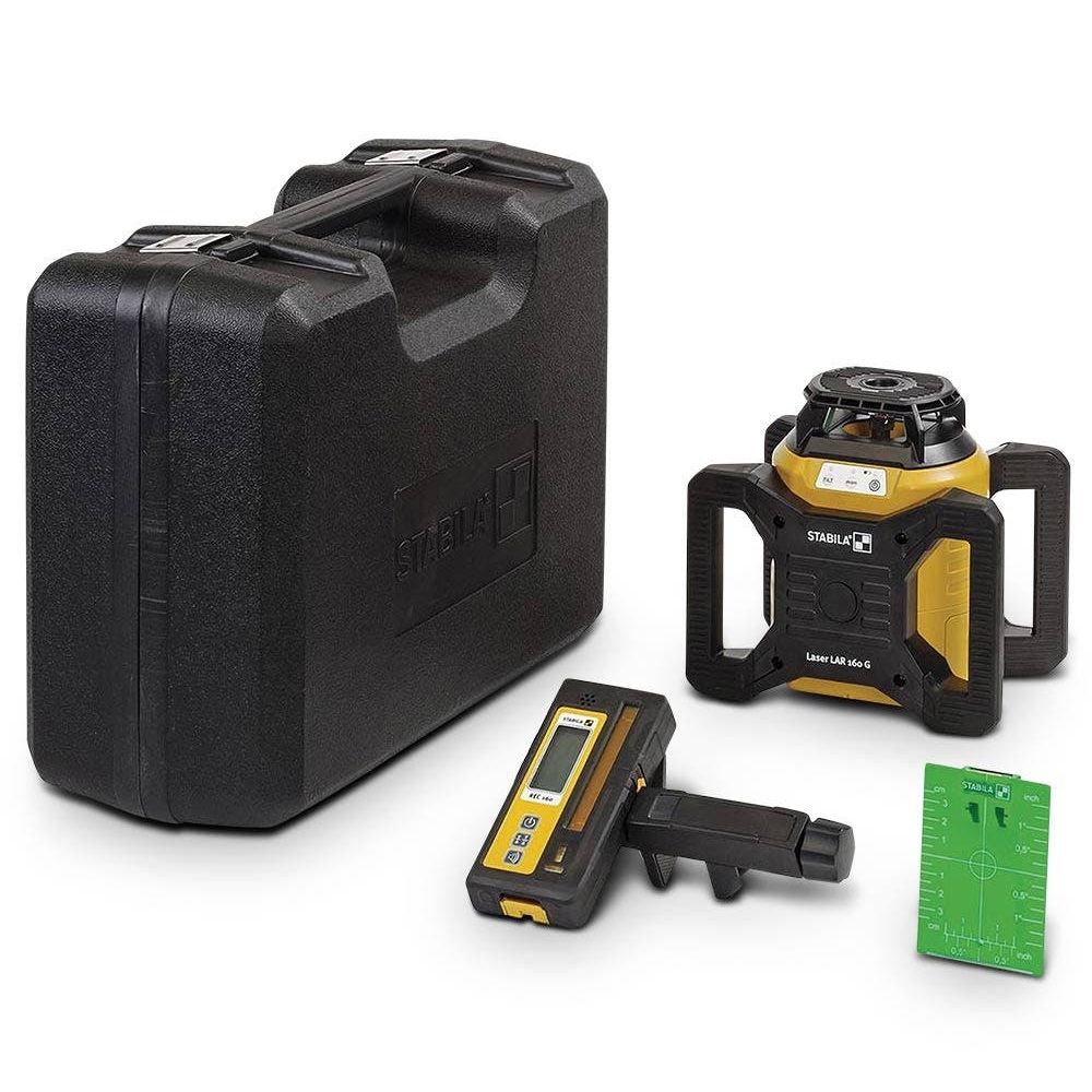 Product Description Description: Are you tasked with horizontal and vertical levelling for major interior construction projects? Do you need to work precisely and avoid costly measurement errors and rework? Then the STABILA LAR 160 G with green laser beams is the right rotation laser for you. Quick to set up and easy to operate, the laser really comes into its own when used over large distances and linked to a receiver. All in all, it is a high-quality product that delivers precise results Features: 2 Year Warranty Fully automatic, motor-driven rotation laser – high levelling accuracy of ± 0.1 mm/m, fast self-levelling function within 20 seconds STABILA GREENBEAM technology for improved visibility of the rotating laser beam – green laser beams are four times more visible to the human eye than red beams Four laser functions for versatile use – horizontal and vertical rotation, plumb-line function and right angle (90°) in vertical operation Protection class IP 65 – dustproof and waterproof Shock-absorbent STABILA soft grip casing provides protection against impacts – the stable housing cover also protects the laser optics Easy to use via three control buttons – on/off, tilt mode, manual mode Battery drawer – easy replacement, even directly on the tripod. Large working area with REC 160 RG set receiver – up to 600 m in diameter Two 5/8″ threads integrated in the housing Target plate with magnetic holder and cross-hair Stable carrying case Application Examples: For a wide range of tasks in drywall construction – for layout work, when positioning partition walls and suspending ceilings Transfer heights quickly and easily in electrical installation work – align plug sockets, switches and cable ducts horizontally and vertically with one another For installation work in industrial construction – measure planes and determine alignments for routing lines and pipes In industrial assembly applications – measure and align shelving systems in logistics areas Technical Data: Laser class 2 Output < 1 mW Laser wavelength 510 – 530 nm Self-levelling range +/- 5° Levelling accuracy +/- 0.10 mm/m Diameter of working area for set receiver 600 m Operating life 20 h Battery type D Protection class IP 65 Tripod connection 5/8″ Kit Includes: LAR 160 G rotation laser REC 160 RG receiver Target plate Carrying case 2 x D 1.5 V batteries 2 x AA 1.5 V batteries UPC: 4005069192402 Enquiry Tell A Friend