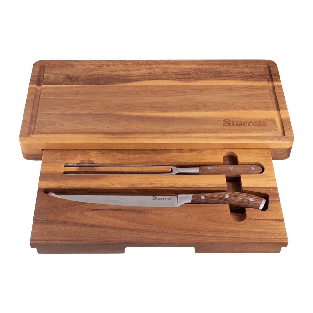 HomeShophandtoolKnives - Hand ToolsStarrett SKK-2WD Professional 2 Piece Carving Knife & Fork Set with Chopping Board 02508