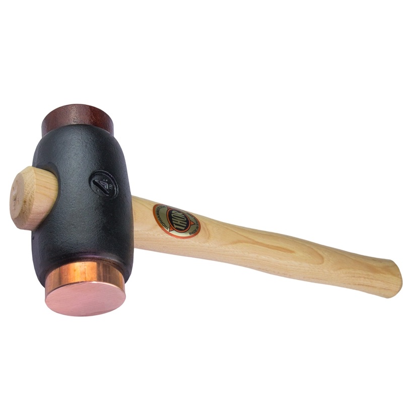 Product Description Features: Copper & Rawhide Face Hammer Malleable Iron head fitted with one Rawhide and one Copper cylindrical face. The malleable Iron head and the Copper/Rawhide faces combine to provide the weight for the blow and the faces prevent damage to most items being struck. Ideal where a heavy blow is required combined with a relatively small striking area. Faces are designed to wear and can be replaced. Used as a multi purpose soft faced hammer in engineering and automotive for assembly, repair and maintenance. Specifications: Brand Thor Style Copper/Rawhide Handle Wood Weight 2.38 kg Approximate Length 355mm 14in Approximate Weight 2380g Face Diameter 50mm 2in UPC: 5012936021603 Enquiry Tell A Friend