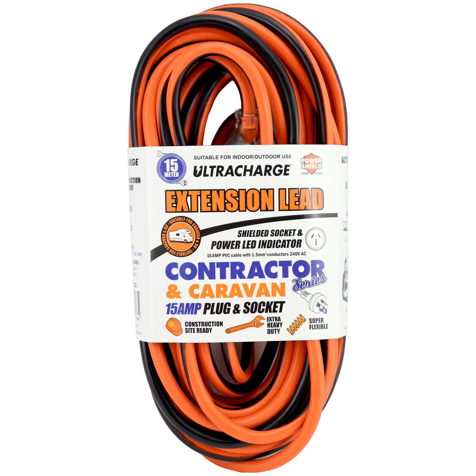 Product Description Features: Shielded socket & power LED indicator 15Amp PVC cable with 1.5mm2 conductors, 240VAC Contractor & Caravan series 15Amp plug and socket Extra heavy duty Super flex…